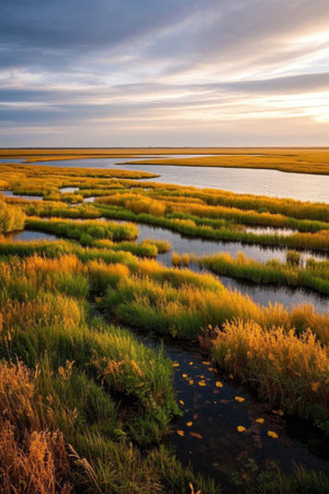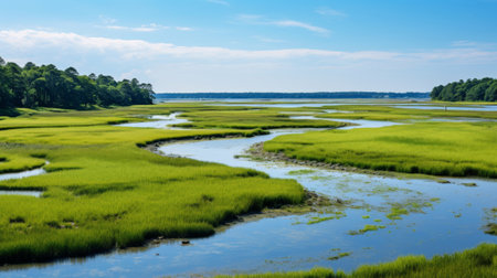 Serene salt marsh landscape in Pleasant Bay, Cape Cod, Massachusetts, featuring meandering channels, lush vegetation, and tranquil atmosphere, perfect for wildlife habitation.