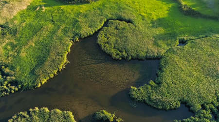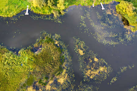 Aerial view of green forest and river marsh landscape in summer. Top view of european nature from high attitude in summer. Birds eye view. Belarus