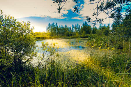 Mysteriously green pond with old stumps and snags in front of the forest at sunset