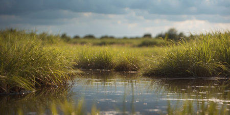 A peaceful wetland showcases dense green grass and tall reeds along the calm water's edge. The sky is bright with fluffy clouds, creating a tranquil atmosphere.