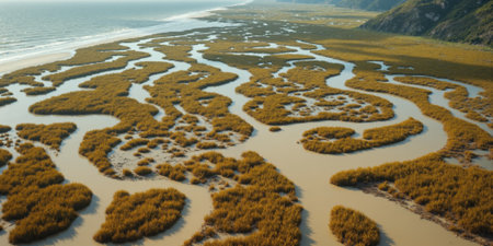 Aerial River Delta Stunning top-down perspective of river meeting ocean, creating intricate branching patterns as waterways divide and subdivide through