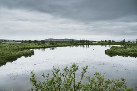 Natural marshland, swamp in Autumn. Dry grass and dead trees by pond or small lake under grey sky.