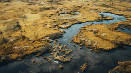 aerial photograph of a river with sandy soil and grass, showcasing atmospheric color washes in the style of beeple. the image features frequent use of yellow, distressed and weathered surfaces, and nature-inspired installations. the color palette includes light azure and amber, creating a captivating visual contrast. the shallow depth of field adds depth and dimension to the composition. ai generated