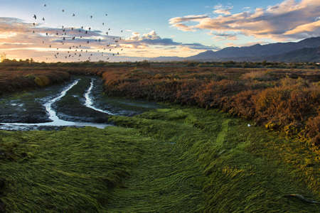 Experience the beauty of a serene wetland at sunrise, where mist dances over calm waters and birds soar through a clear sky, creating a peaceful outdoor landscape.