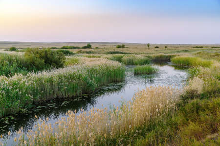 Evening summer landscape with a steppe river. Bolshaya Karaganka river near Arkaim village, Russia
