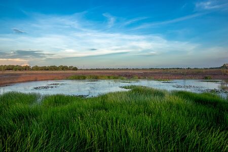 Fresh scenery countryside with pond natural and clear sky background, clean summer landscape panorama, Ideal as for background and nature design