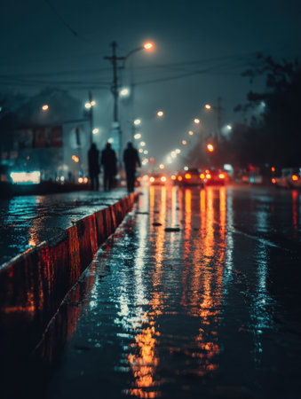 Reflections of city lights shimmering on the surface of a rain-soaked nighttime road