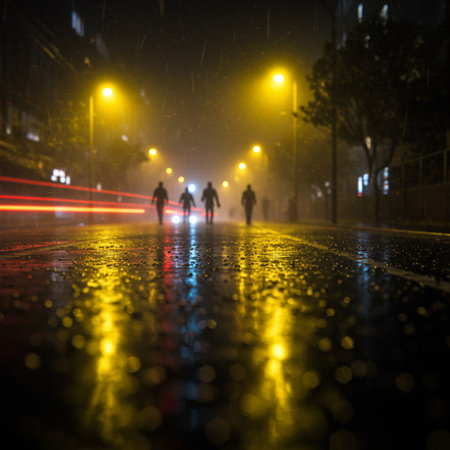 A nighttime scene depicts a rain-soaked urban environment. Illuminated streetlights cast a warm glow, reflecting off the wet pavement. Buildings and structures are visible in the background. The image has potential for various uses, including editorial and commercial projects.
