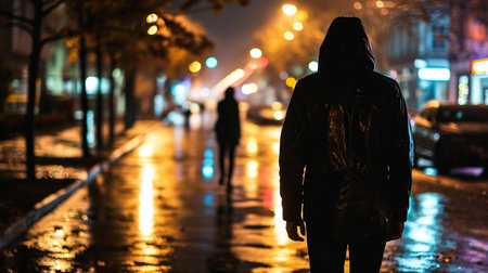 A young boy in a dark hoodie with the hood up, walking along an empty street on a rainy day, with puddles reflecting the soft city lights.