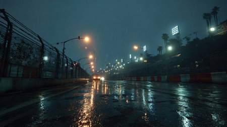 This captivating nighttime image of a race track captures the vibrant reflections on wet pavement under dramatic lights, creating an electrifying atmosphere.