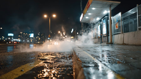 Atmospheric nighttime city scene featuring steam rising from the street, a glowing bus stop, and wet pavement, creating a vibrant urban ambience.