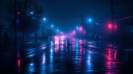 A mesmerizing view of a city street at night, illuminated by colorful lights and enveloped in fog. The wet pavement reflects vibrant hues, creating an atmospheric scene.