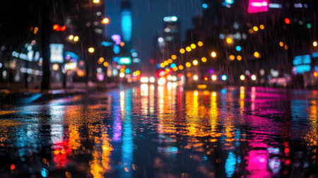 The image showcases a nighttime cityscape with colorful lights reflecting on a rain-slicked street. The composition emphasizes the vibrant hues and textures of the city lights and their reflections. It evokes a sense of urban atmosphere, suitable for various editorial and commercial applications. The lighting suggests a wet night in an urban environment.