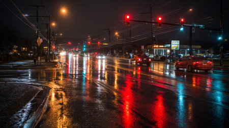 A dynamic night scene showcasing a city street illuminated by traffic lights, with vibrant reflections on a wet road, capturing the essence of urban life after rain.