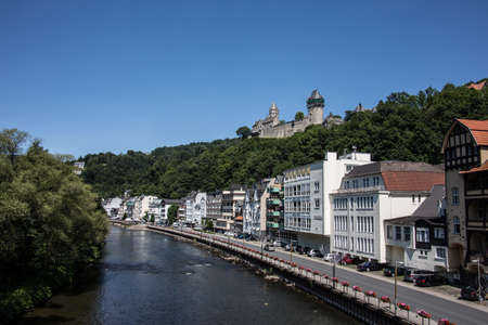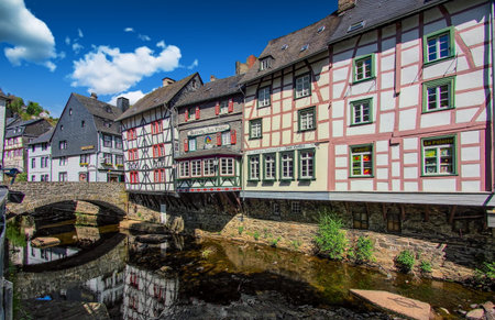 MONSCHAU, GERMANY - MAY 22nd 2019: Small picturesque town in the Eifel region in Noth Rhine-Westphalia. It is famous for its half-timbered houses and cobblestone streets