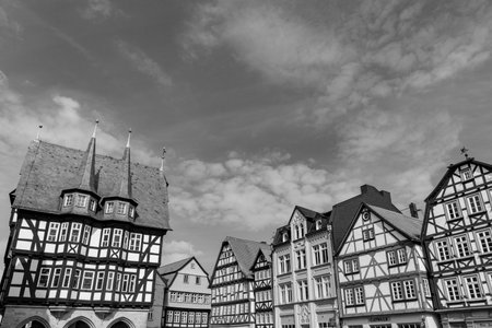 Alsfeld, Germany - June 25, 2021: famous town hall and half timbered historic houses at central square in Alsfeld, germany.
