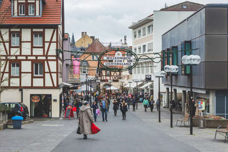 Bad Kissingen/Germany-31/12/18: people walking on Obere Marktstrasse in Bad Kissingen downtown in Bavarian region, Germany. Bad Kissingen is one of Germany's best-known health resorts