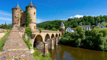 This captivating image features a historic bridge with stone towers over a tranquil river, surrounded by vibrant greenery and blue sky, perfect for travel inspiration.