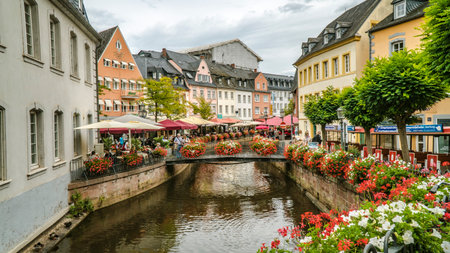 SAARBURG, GERMANY - SEPTEMBER 13 2019: city center of Saarburg with creek and restaurants at the promenade. The creek is the source for the water mills at bottom of valley.t