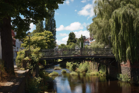A serene river flows beneath a small black bridge, framed by vibrant trees and historical buildings under a bright blue sky. The peaceful atmosphere invites relaxation.