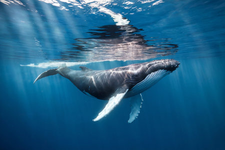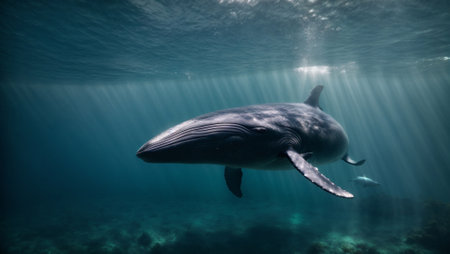A dramatic underwater scene featuring a massive humpback whale gliding gracefully through the deep blue ocean. Sunbeams penetrate the water, illuminating the gentle giant in an ethereal glow.