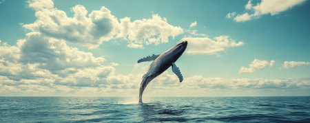 AI-Generated image of a majestic humpback whale breaching high above the ocean surface, water droplets cascading from its body as it arcs gracefully under a clear blue sky.