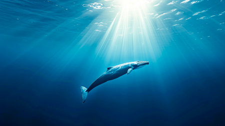A whale is swimming in the ocean with the sun shining on it. Concept of freedom and beauty as the whale gracefully moves through the water