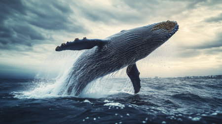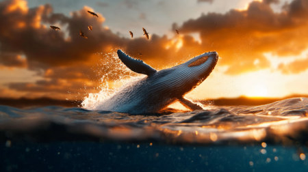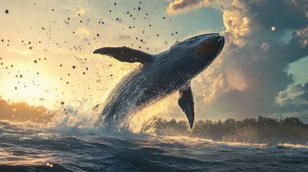 A breathtaking scene captures a whale breaching the ocean's surface, creating dynamic splashes and reflecting the beauty of marine life in nature's environment.
