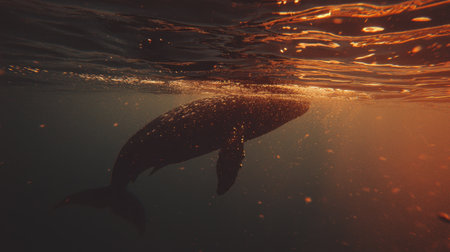 A majestic whale swims gracefully through golden ocean waters during sunset, creating an enchanting and tranquil underwater scene full of beauty.