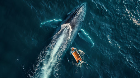 An aerial view of a boat and a whale in the fluid waters of the ocean