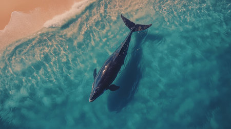 whale captured from above, gracefully gliding through the serene turquoise ocean depths.