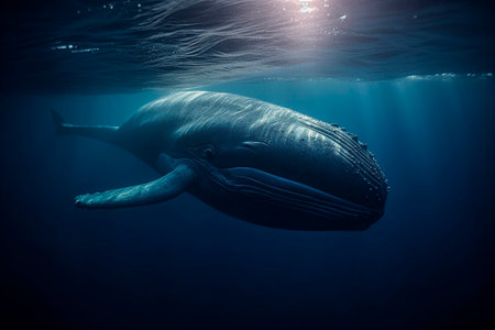 Majestic whale gliding gracefully in deep blue ocean waters. concept of marine life, underwater exploration, oceanic beauty.