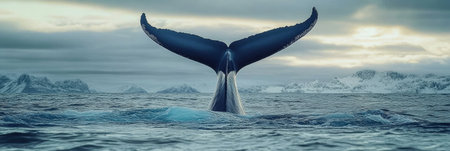 Majestic Winter Fjord Scene With Whale Tail Plunging Down Into the Icy Arctic Ocean Waters Below