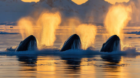 Witness a breathtaking scene of majestic whales breaching the water's surface at sunset, surrounded by tranquil arctic landscapes, showcasing the beauty of marine wildlife.