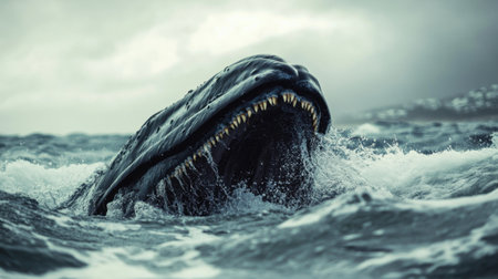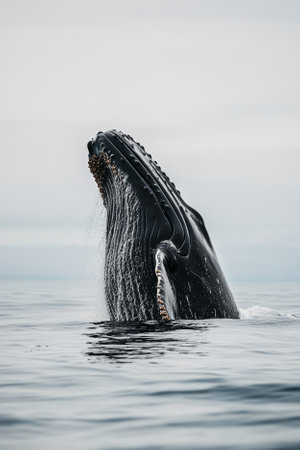 A stunning scene of a humpback whale breaching the water's surface, showcasing its massive body and fins in a natural marine habitat. Perfect for wildlife enthusiasts.
