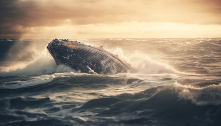 A stunning image of a whale breaching the ocean surface at sunset, creating a mesmerizing scene with dramatic clouds and vibrant colors, showcasing the beauty of marine wildlife.