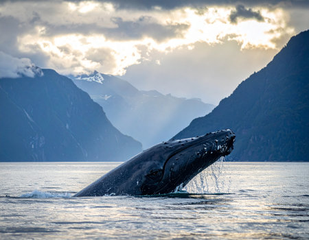 A stunning whale tail emerges dramatically from serene waters, highlighted by a golden sunset backdrop, enhancing the tranquil mountainous landscape.