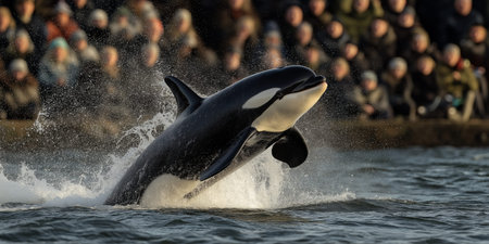 An orca performs a powerful leap in front of a large crowd, splashing as people watch intently