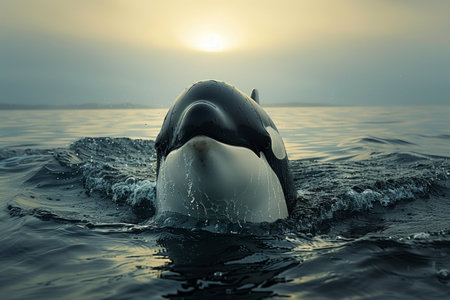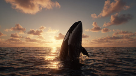 An orca whale breaks the water's surface, its form silhouetted against a vibrant sunset. The ocean reflects the warm hues of the sky, creating a serene and natural scene. This image showcases marine life in its environment. Suitable for ecological content or visual storytelling.