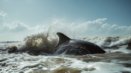 A stunning whale fin gracefully emerges from the ocean as waves crash around it, creating a mesmerizing scene of marine beauty and power.