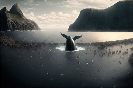 Grindadrap Faroe island whaling dolphin and whale hunting dramatic illustration generative ai