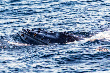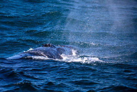 Southern whale just breathing after having emerged from the depths of the Atlantic Ocean near the South African town of Hermanus, one of the best places in the world to observe marine animals.
