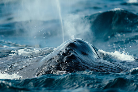 Witness the breathtaking sight of a whale breaching the calm ocean surface, creating a stunning misty spray against the clear sky and tranquil waters.