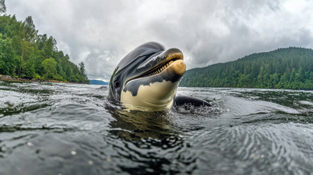 A striking close-up of a dolphin surfacing in calm waters showcases the connection between marine life and its natural environment under a dramatic sky.