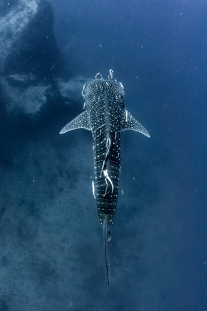 Whale shark in blue ocean near Sumbawa. Giant shark swimming underwater