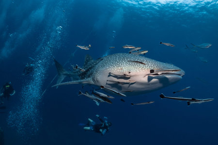 Whale shark swimming in clear blue water with raymorrey fish and pilot fish