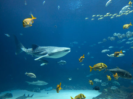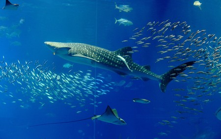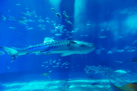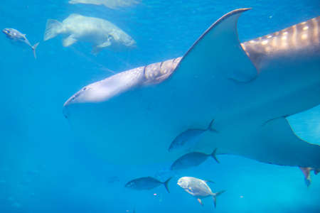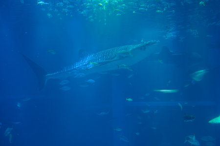 Whale shark and other fish swimming in a tank at Osaka Aquarium Kaiyukan