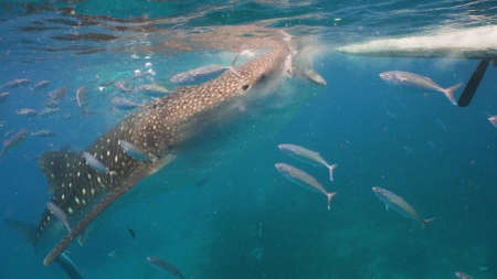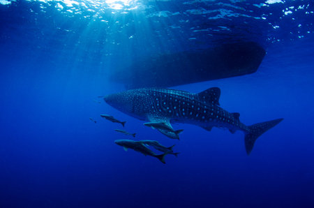 Whale shark (Rhincodon typus) accompanied by several remoras under a diving boat in Koh Tao, Thailand