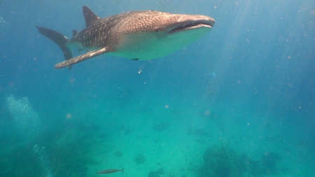 Giant whale sharks in Cebu, philippines. Swimming with these big marine animals underwater. shot with action camera under water