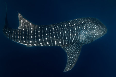 Whale shark swimming gracefully underwater in the deep blue ocean, showcasing marine wildlife beauty.